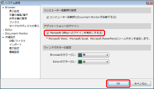 [システム設定] > [共通設定] > [環境設定] > [Microsoft Officeへのアドインを有効にする]にチェックマークを付けて、[OK]をクリックします。