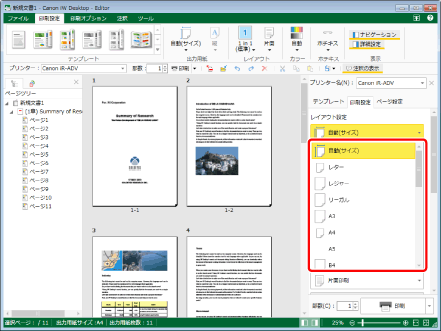 原稿の向きやサイズの異なる原稿が混在する文書の出力用紙サイズを[自動(サイズ)]以外に設定した場合、原稿は設定された用紙幅に合わせて自動的に拡大/縮小されます(原稿ページは自動的に回転されません)。