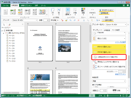 詳細ウィンドウ > [印刷設定]タブ > [印刷の詳細設定]で、[文書全体をホチキス留めする]を選択します。