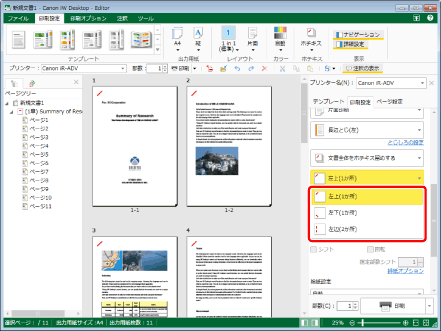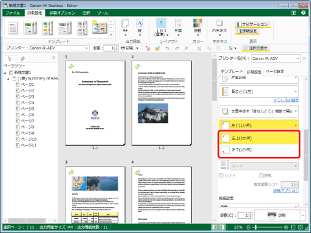 詳細ウィンドウ > [印刷設定]タブ > [印刷の詳細設定]で、ホチキスの位置を選択します。
