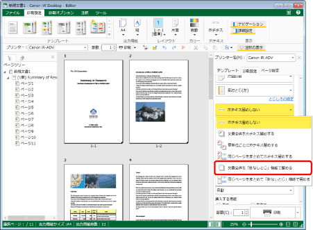 詳細ウィンドウ > [印刷設定]タブ > [印刷の詳細設定]で、[文書全体を「針なしとじ」機能で留める]を選択します。