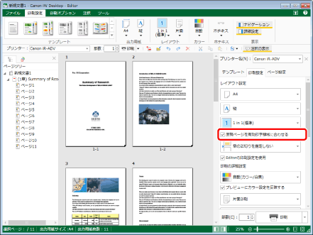 [原稿ページを有効印字領域に合わせる]にチェックマークを付けずに印刷を行う場合、原稿ページが有効印字領域からはみ出している部分は印刷されません。また、はみ出している部分に付与されている注釈は、正しく印刷されない場合があります。この場合は、印刷時、およびPDFエクスポート時に警告メッセージが表示されます。