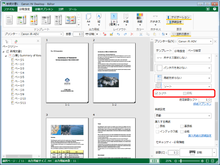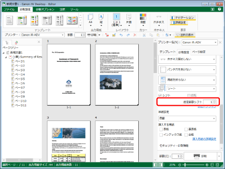 [シフト]にチェックマークを付けた場合に、部数を指定できます。ここで指定した部数ごとに位置をずらして排紙されます。排紙方法の選択で、[ソート]かつ[シフト]を選択した場合に、変更できます。