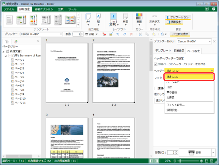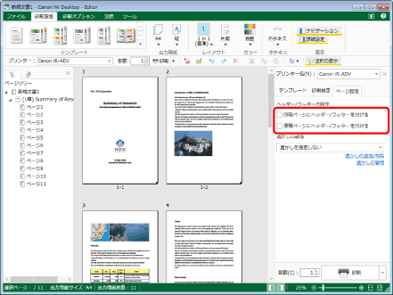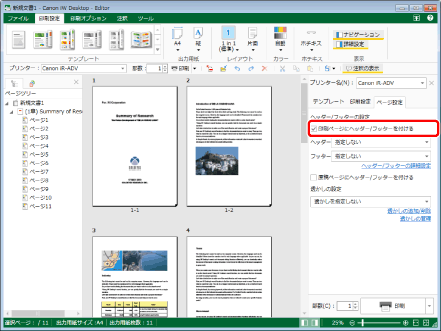 詳細ウィンドウ > [ページ設定]タブ > [ヘッダー/フッターの設定]で、[印刷ページにヘッダー/フッターを付ける]にチェックマークを付けます。