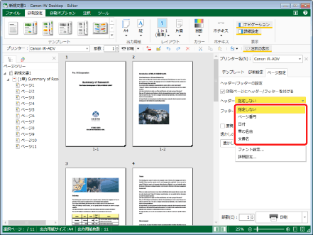 詳細ウィンドウ > [ページ設定]タブ > [ヘッダー/フッターの設定]で、ヘッダー/フッターに設定する項目をプルダウンリストの中から選択します。