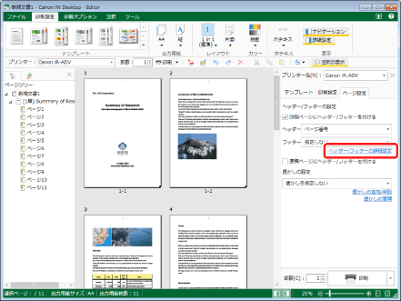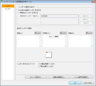 詳細ウィンドウ > [ページ設定]タブ > [ヘッダー/フッターの設定]で、[ヘッダー/フッターの詳細設定]をクリックします。