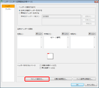 詳細ウィンドウ > [ページ設定]タブ > [ヘッダー/フッターの設定]で、各[ヘッダー]/[フッター]のプルダウンリストから、[フォント設定]を選択