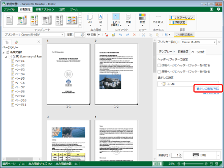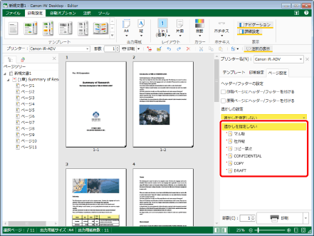 詳細ウィンドウの[ページ設定]タブで、 [透かしの追加/削除]をクリックして表示される[透かしの追加/削除]ダイアログボックスの[設定済みの透かし]に複数追加した場合は、詳細ウィンドウ > [ページ設定]タブの透かしのプルダウンリストが[ユーザー設定]に変わります。