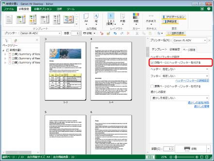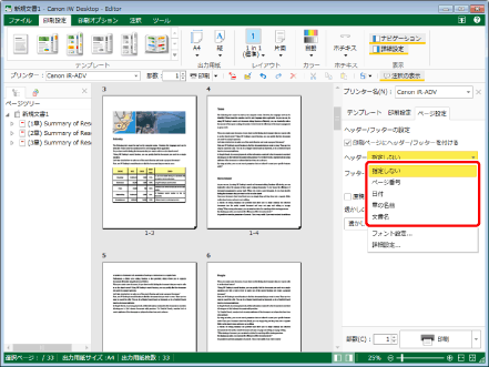 [印刷ページにヘッダー/フッターを付ける]、[原稿ページにヘッダー/フッターを付ける]ともに操作方法は同じです。