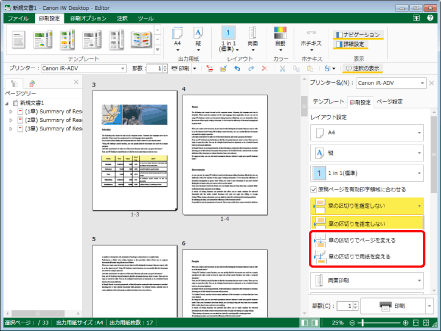 章の区切りを設定しない場合は、詳細ウィンドウ > [印刷設定]タブ > [レイアウト設定]で、[章の区切りを指定しない]を選択します。または、リボンの