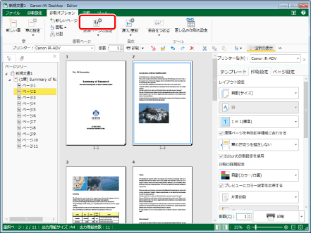 キヤノン製プリンターを選択し、詳細ウィンドウの[印刷設定]タブ、リボンのコマンド、ツールボタンのいずれかで、[Editorの印刷設定を使用]にチェックマークを付けた場合に設定できます。