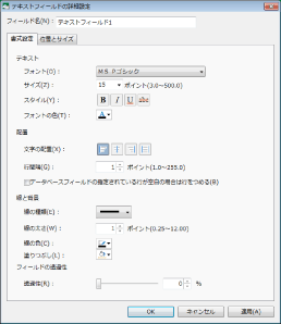 クリックすると、[テキストフィールドの詳細設定]ダイアログボックスが表示されます。[テキストフィールドの詳細設定]ダイアログボックスでは、テキストフィールドの詳細を設定できます。詳細は次を参照してください。