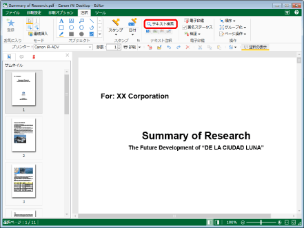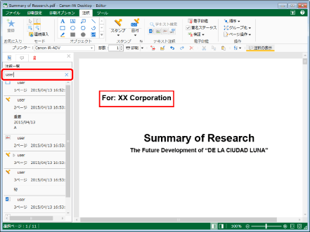 検索対象は、ナビゲーションウィンドウの[注釈一覧]タブに表示される次の注釈の文字列、ユーザー名、更新日時、およびページ番号が対象となります。