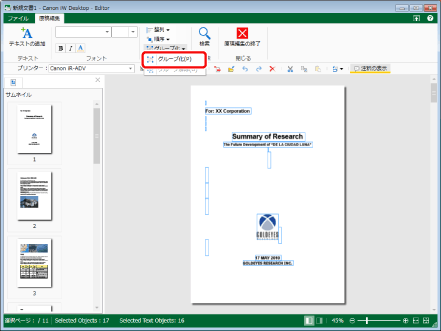 ツールバーに表示させた注釈モード用のツールボタンでは、オブジェクトのグループ化/グループ化解除はできません。