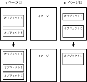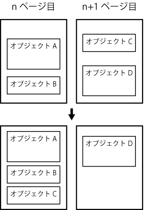 余白をつめる機能を実行すると、余白がつめられてページの上方向にオブジェクトが移動します。そして、ページの下部に空いたスペースに、次のページのオブジェクトが移動します。