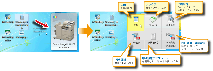 簡単印刷ツールは、印刷/ファクス送信などのデバイスの機能をより直感的に操作できるアプリケーションです。簡単印刷ツールを作成すると、使用しているプリンター/ファクスを見やすいアイコンでWindowsのデスクトップ画面に表示します。