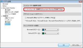[ファイル]メニュー > [オプション] > [システム設定] > [共通設定] > [環境設定] > [コンピューター起動時にDocument Monitorを起動する]