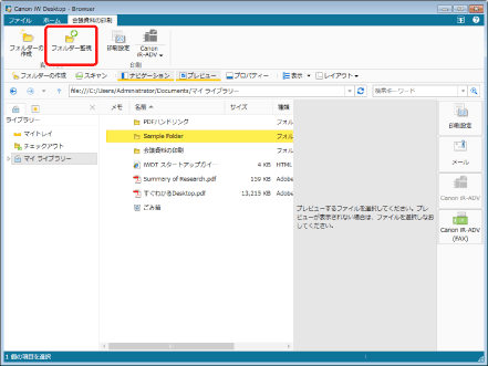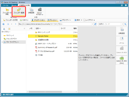未接続のDocument Serverライブラリー、または認証の必要なネットワークドライブ上のライブラリー内のフォルダーを選択する場合は、ライブラリーへの接続が必要です。接続方法については、次を参照してください。