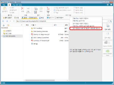 이 섹션에서는 도구 모음에 표시되는 버튼을 크기가 큰 버튼으로 변경하는 방법에 대해 설명합니다.