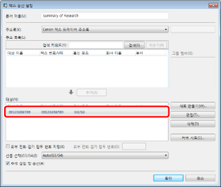 사용할 팩스 드라이버가 G3/G4 이외 옵션을 지원하는 경우 팩스 번호가 [대상 이름]에 표시되고, [팩스 유형] 및 [통신 모드]는 비어 있게 됩니다. [대상]에서 주소를 선택한 후 [편집]을 클릭하여 수정합니다.