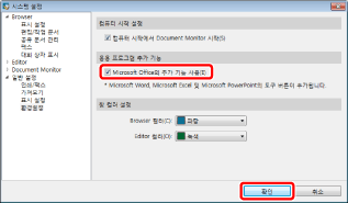 [시스템 설정] > [일반 설정] > [환경설정]에서 [Microsoft Office의 추가 기능 사용]을 선택하고 [확인]을 클릭합니다.
