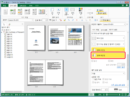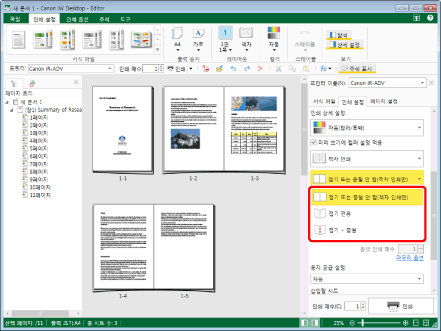 이 기능은 세부사항 창의 Canon 프린터와 세부사항 창의 [인쇄 설정] 탭의 [Editor의 인쇄 설정 사용] 확인란, 리본 메뉴 명령, 도구 버튼을 선택한 경우에만 사용할 수 있습니다.