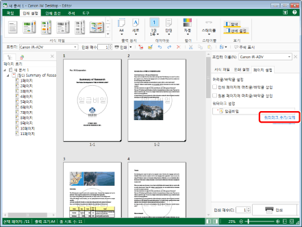 여러 개의 워터마크를 추가하려면 세부사항 창의 [페이지 설정] 탭에서 [워터마크 추가/삭제]을 클릭합니다.
