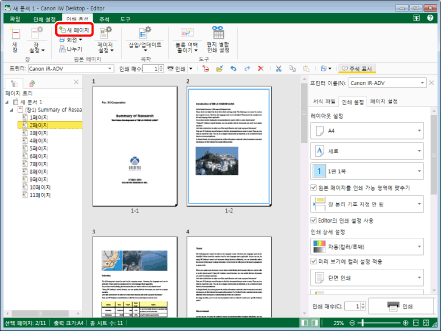 새 페이지를 삽입할 위치로 장을 선택한 경우 새 페이지가 선택한 장의 첫 페이지와 같은 용지 크기/방향으로 장의 첫 페이지로 삽입됩니다. 선택한 장에 페이지가 없으면 새 페이지가 선택한 장에 설정된 출력 용지 크기/방향 설정으로 추가됩니다.