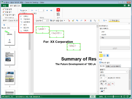 Desktop Editor의 메일 병합 인쇄 설정 모드에서 삽입한 필드의 위치를 정렬할 수 있습니다.