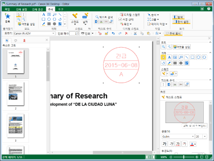 설치하는 동안 자동으로 등록된 텍스트 스탬프뿐만 아니라 새로 등록한 텍스트 스탬프도 삽입할 수 있습니다. 자세한 내용은 다음을 참조하십시오.