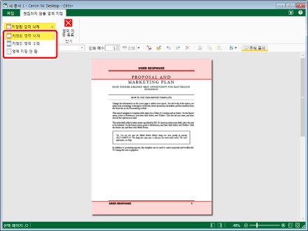 다음 페이지에서 여백이 줄어들지 않습니다. 이 때문에 [지정된 영역 삭제]를 선택하는 경우에도 편집을 수행할 수 없는 지정된 영역 내의 영역은 삭제되지 않습니다. 이러한 경우 삭제할 개체를 수동으로 삭제합니다.