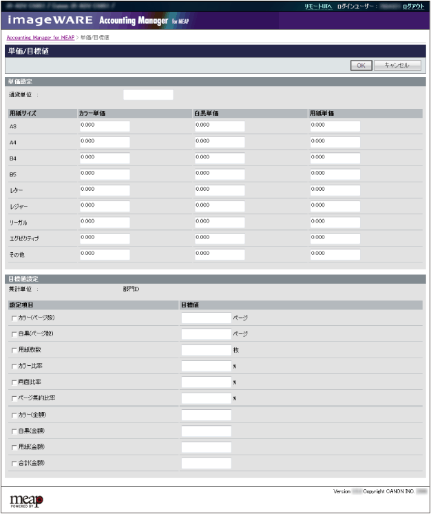 用紙サイズに対する単価と目標値の設定(iR-ADVのみ)