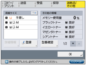 (状況確認/中止)を押すと、[状況確認/中止]画面が表示されます。Access Management Systemを運用している場合、デバイスにログインするまでは、[状況確認/中止]画面でデバイスの状況は表示できますが、コピーや送受信の状況などは表示できません。|
