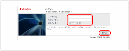 [Administrator]ロールが関連付けられているユーザーのユーザー名とパスワードを入力し、[ログイン先]で[このデバイス]を選択して、[ログイン]をクリックします。