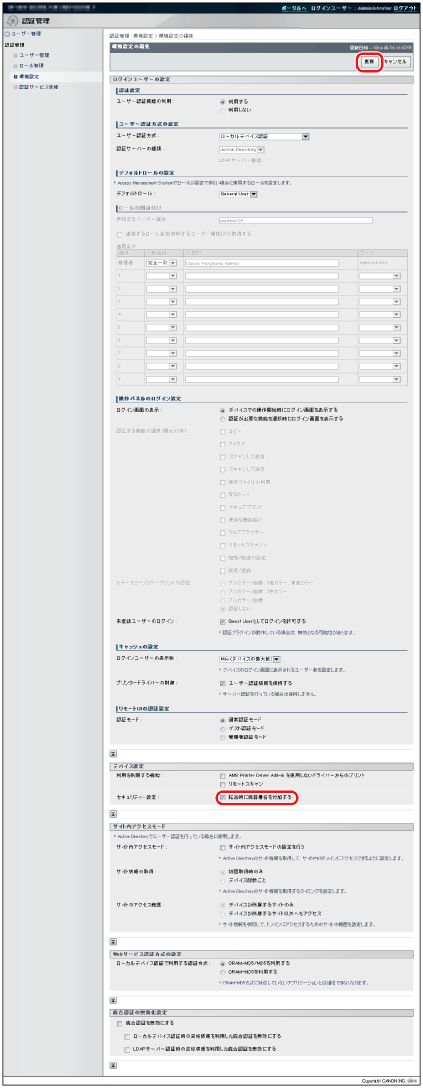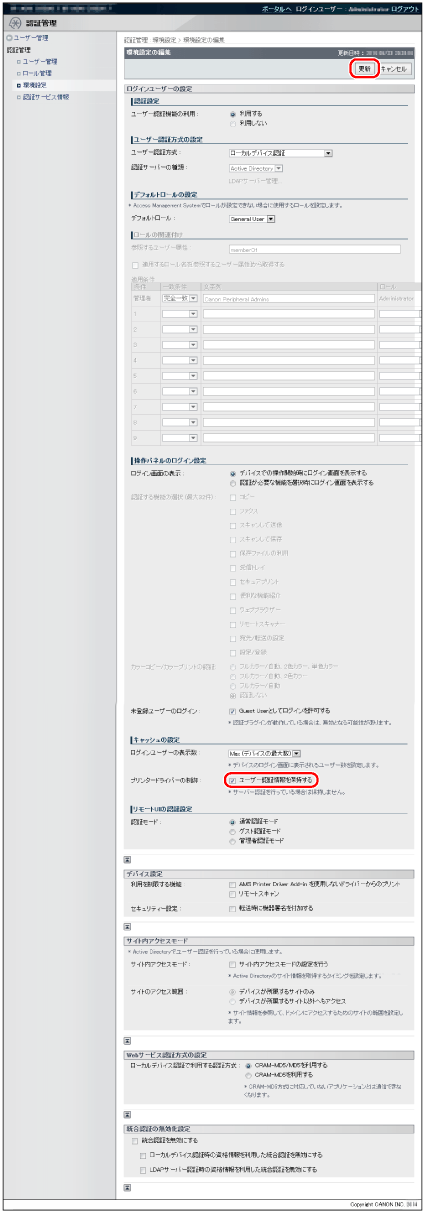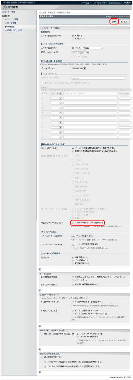 機能別認証を選択する場合は、登録ユーザーに適用する使用制限が未登録ユーザーの使用制限(ゲストロール)よりも厳しくならないように、カスタムロールの作成/編集時やゲストロールの編集時に、特に注意してください。登録ユーザーに適用する使用制限が未登録ユーザーの使用制限よりも厳しい場合、ログイン前よりもログイン後の方が使用できる機能が少なくなってしまうので、適切にユーザー管理ができなくなる可能性があります。