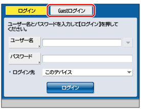 ログイン方式としてデバイス認証を選択している場合に、[Guest Userとしてログインを許可する]にチェックマークを付けると、デバイスのタッチパネルディスプレーには、以下のようなログイン画面が表示されます。未登録ユーザーがログインするときは、ユーザー名とパスワードを入力しないで、[Guestログイン]を押します。未登録ユーザーが使用できる機能は、[Guest User]ロールの使用制限情報に従います。