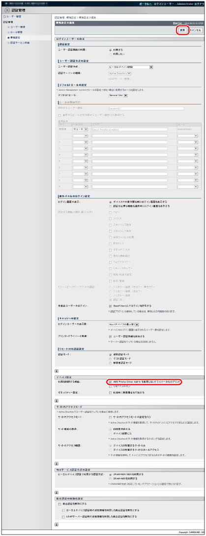 [デフォルトロールの設定]の設定は、デバイスの再起動後に有効になります。再起動の方法については、デバイスに付属の取扱説明書を参照してください。