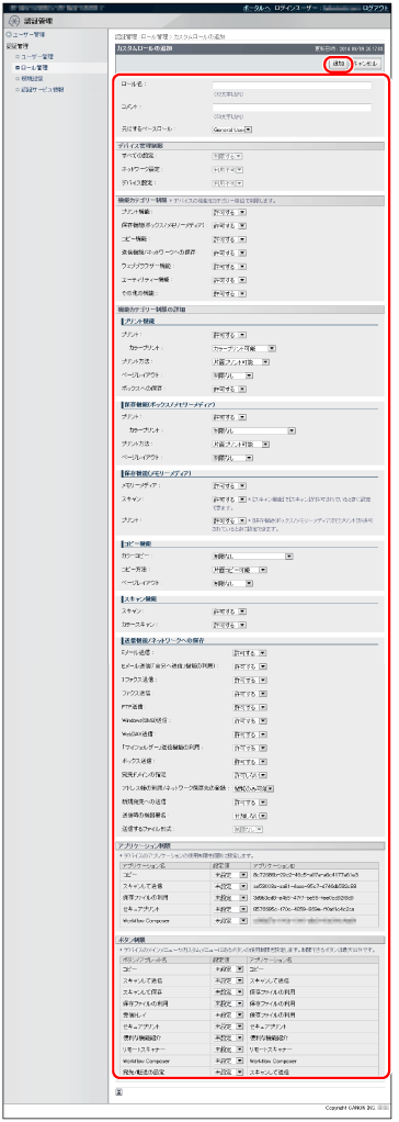 [制限する]に設定されている場合は、[デバイス設定]と[ネットワーク設定]の設定値に従って、デバイス管理権限が制限されます。([デバイス設定]と[ネットワーク設定]の両方が[制限なし]に設定されても、デバイス管理権限について、[Administrator]ロールと同等の権限はありません。)
