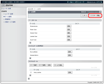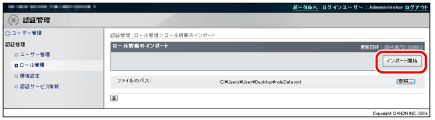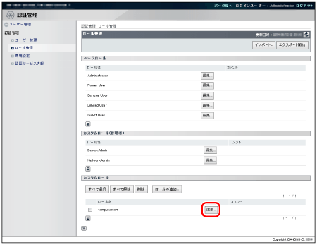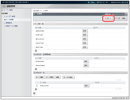 インポートしたロールと同じロール名がすでに登録されていた場合は、インポートしたロール情報で上書きされます。ただし、ゲストロール以外のベースロールおよびカスタムロール(管理者)は、コメントのみが上書きされます。