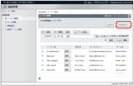[ユーザー管理]ページで、[エクスポート]をクリックします。
