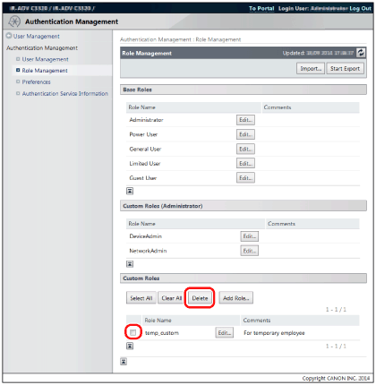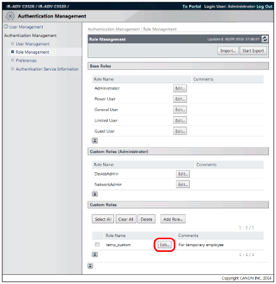 To change the [Base Role] setting (and therefore change the device management privileges), it is necessary to delete the role, and then register it again. (It is also possible to export the role and change the [Base Role] setting by editing it with a text editor. However, take care not to edit the control characters in this case.)
