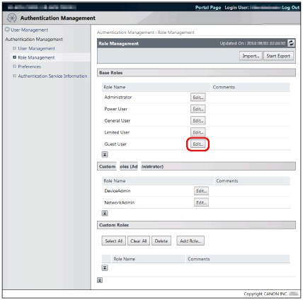 It is recommended you export the role information after editing [GuestUser] role for backup purposes. For more information, see "Exporting Roles."