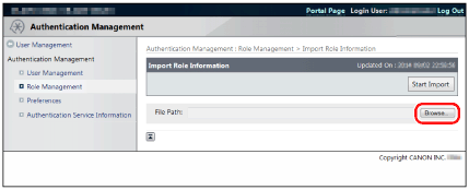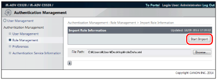 If roles not included in the import file were registered in the device, those roles are not deleted, and the roles inside the import file are added to the device.