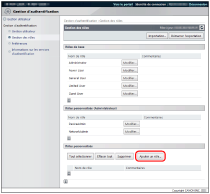 Il est possible d'enregistrer 100 rôles au maximum, rôles de base et rôles personnalisés (administrateur) inclus.