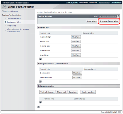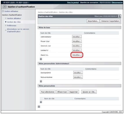 Lorsque l'on modifie le rôle [GuestUser], il est recommandé d'exporter les paramètres de rôles afin de les sauvegarder. Pour plus d'informations, voir « Exportation de rôles ».