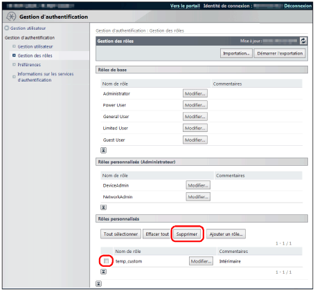 Les rôles de base et les rôles personnalisés (administrateur) ne peuvent pas être supprimés.