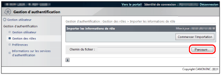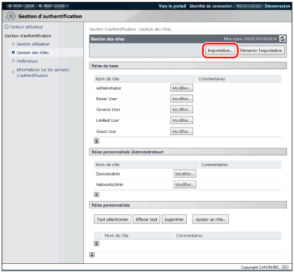 Les rôles enregistrés sur le périphérique qui ne figurent pas dans le fichier d'importation ne sont pas supprimés ; les rôles définis dans le fichier d'importation sont chargés sur le périphérique.
