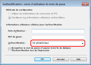 Si l'option [Enregistrer le mot de passe et passer la boîte de dialogue d'authentification lors de l'impression] est sélectionnée, il est possible d'imprimer sans saisir de mot de passe. Toutefois, il est recommandé d'activer la saisie d'un mot de passe à chaque impression, afin de renforcer la sécurité. L'option [Enregistrer le mot de passe et passer la boîte de dialogue d'authentification lors de l'impression] est automatiquement activée si l'option [Enregistrer les informations d'authentification utilisateur] est sélectionnée sous [Gestion des pilotes d'impression] lors de la définition des préférences des périphériques. Pour plus d'informations, voir « Définition des préférences des périphériques ».