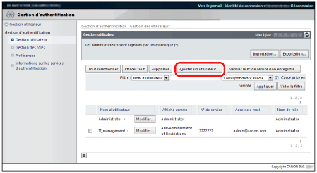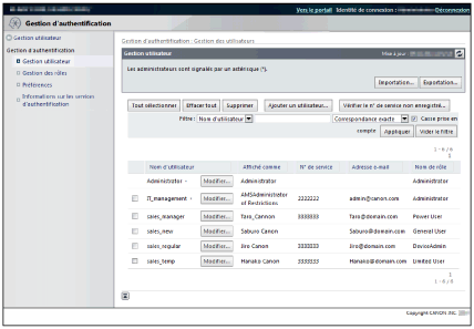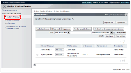 Les utilisateurs qui ne sont pas administrateurs des restrictions d'utilisation des périphériques peuvent modifier leur propre mot de passe. Ceci permet de renforcer la sécurité. Ces administrateurs doivent informer les autres utilisateurs qu'ils ont la possibilité de modifier leur propre mot de passe. Pour plus d'informations sur la modification du mot de passe, se reporter aux manuels d'instructions du périphérique.