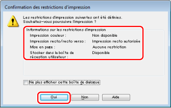 Dans cet exemple, la boîte de dialogue [Confirmation des restrictions d'impression] s'affiche car l'option [Vérifier les informations sur les restrictions d'impression lors de l'impression] a été sélectionnée lors de la définition du compte utilisateur dans l'extension AMS Fonctions additionnelles.